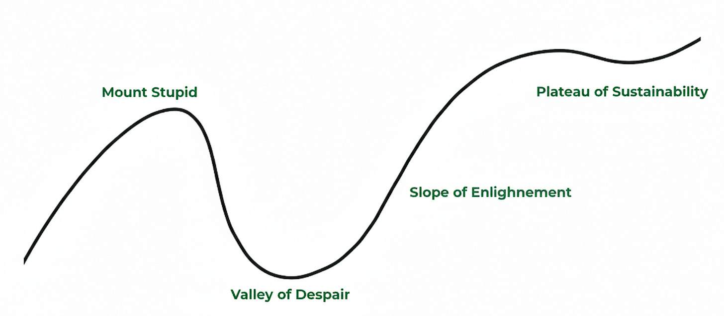 If you think 2 hours, but domain experts spend 2 years training their juniors - you’re probably at the top of Mount Stupid.